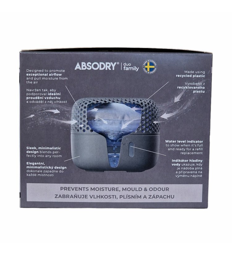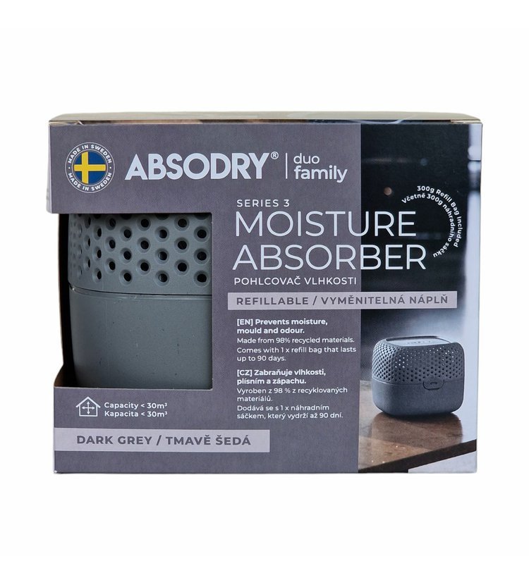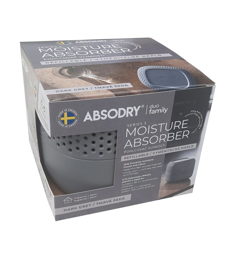 Chcete si doma zajistit ideální podmínky pro odpočinek? Pohlcovač Everband Sweden snižuje míru vlhkosti i nepříjemného zápachu. Je určený pro místnosti do 30 m³. Součástí pohlcovače je sáček s hydroskopickými krystaly o hmotnosti 300 g. Přitahují a absorbují vzdušnou vlhkost, která v nich kondenzuje a odkapává do nádržky ve spodní části pohlcovače.