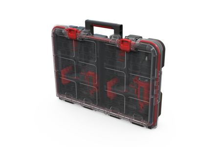 Skládá se ze 2 oddílů, do kterých umístíte drobné součástky, doplňky a jiné řemeslné potřeby. Přihrádky se dají vyjmout, čímž zvětšíte úložný prostor. Poté snadno do boxu uložíte i větší nářadí. Kovové spony zajistí pevné uzavření víka. Obsah organizéru se vám tedy nevysype a zůstane v bezpečí. Rukojeť vám navíc zjednoduší přenášení boxu.