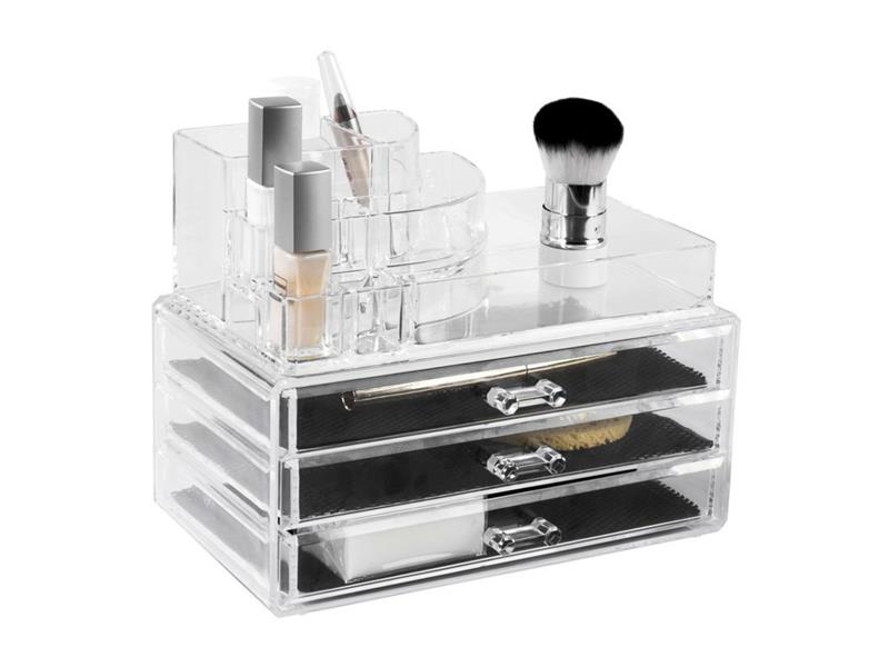Velký organizér na kosmetiku Compactor je vyrobený z čirého pevného plastu. Skládá se ze 3 zásuvek a horního úložného dílu - ideální pro skladování veškeré kosmetiky. Rozměry 24 x 15 x 18,7 cm. S tímto velmi jednoduchým organizérem od společnosti Compactor budete mít vše potřebné přehledně na jednom místě. Mnoho oddělených přihrádek dobře poslouží nejen na rtěnky a řasenky ale i na kosmetické štětce, vatové tyčinky a další drobnosti, které každá žena má ráda po ruce. Organizér je vyroben z lehkého a zároveň velmi odolného plastu, který je čirý a hladký a jeho údržba je velmi snadná a jednoduchá. Díky tomu, že je celý organizér průhledný, máte okamžitě přehled o všech věcech v organizéru uložených. Čirý plast je rovněž velmi nadčasový, organizér se bude hodit do každé domácnosti, na každý toaletní stolek, do každé koupelny. Organizér Compactor vám pomůže udržet pořádek ve vaší kosmetice.