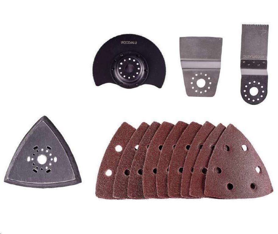 Výrobek je dodáván s trojúhelníkovou deskou pro broušení, s devíti brusnými papíry různé zrnitosti (3*P60 / 3*P80 / 3*P120), škrabkou, pilovým kotoučem pro řezání dřeva a plastů (HCS), pilovým listem pro dřevo, plasty a měkké kovy (HSS).