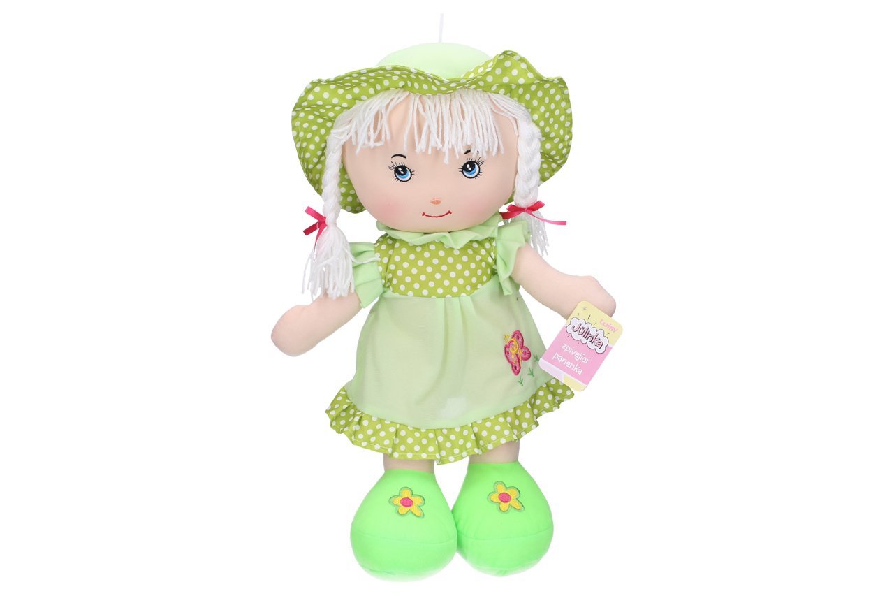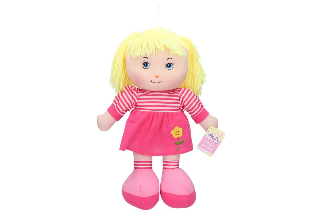 Velká látková panenka Jůlinka o výšce 55 cm tuze ráda zpívá, čímž vykouzlí úsměv na tváři každé malé holčičce, která miluje hudbu. Po jemném stisknutí bříška začne zpívat 1 ze 6 českých lidových písní – Travička zelená, Kočka leze dírou, Červený šátečku, Prší, prší, Já do lesa nepojedu a Holka modrooká, díky čemuž se vaše maličká hravou formou naučí jejich text i melodii. Hračka existuje hned ve 4 různých barevných variantách, které jsou dodávány zcela náhodně.