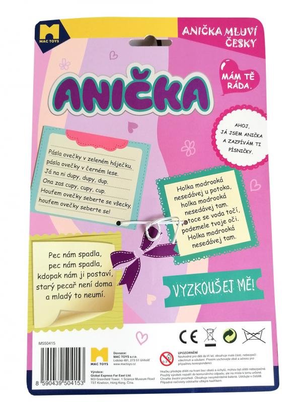 Krásná látková panenka MAC TOYS Anička potěší každou malou holčičku. Vymyslí si pro ni příběhy, přitulí se a vyzkouší, jaké písničky a básničky Anička umí přednášet. Váš potomek může zpívat s panenkou nebo se díky ní naučí písně, které doteď neznal. Přidejte se k němu a společně si zazpívejte Pásla ovečky, Pec nám spadla nebo Holka modrooká.