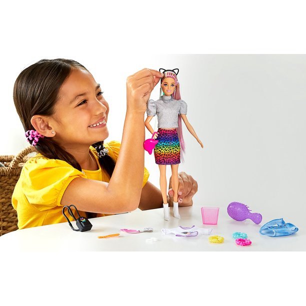Panenka Barbie Leopard Rainbow Hair W s duhovými vlasy a doplňky je ztělesněním dlouhé tradice Mattelu. Její jemné kadeře vytváří okouzlující ombre efekt v odstupňovaných barevných odstínech a při kartáčování studenou vodou odhalují jinak skrytý leopardí vzor. Panenka se dodává se širokou škálou doplňků, jako jsou 2 jehlice do vlasů, 3 náramky, gumičky do vlasů, kartáč, tričko se srdíčkem a bleskem, džínová vesta, leopardí pouzdrová sukně, kočičí kabelka a uši, náhrdelník, batoh, 2 páry bot, houbička pro změnu barvy vlasů a nádoba na ledovou vodu, které přináší naprosto jedinečné možnosti kreativního hraní, módy a stylingu.