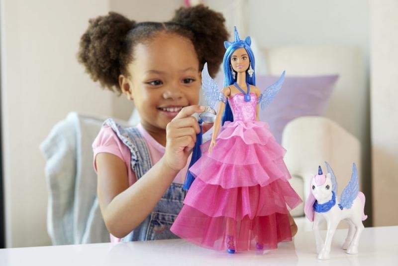 Panenka je oblečená do růžových šatů s nařasenou sukní. Její modré vlasy dítě ozdobí čelenkou s rohem jednorožce. Na ruce nasadí pár modrých křídel. Promění ji v kouzelnou bytost, pro kterou jistě vymyslí spoustu krásných příběhů.