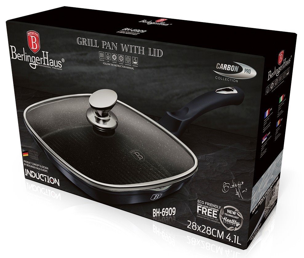 Grilovací pánev Berlingerhaus Carbon Pro BH-6909 o průměru 28 cm se stane nepostradatelným pomocníkem v moderní i klasické kuchyni, kdy se bude skvěle vyjímat v každém prostoru bez ohledu na daný konceptuální styl. Zásluhou kombinace zvolených materiálů je odolná vůči vysokým teplotám i mnoha dalším vlivům, díky čemuž vám bude sloužit spolehlivě a po mnohem delší dobu a zároveň vám rozšíří možnosti použití. V této pánvi tak velice snadno připravíte chutné grilované pokrmy i dušené a pečené pochoutky všeho druhu, které zaručeně potěší vaše chuťové pohárky hned při prvním soustu. Pánev pak představuje EcoFriendly produkt, neboť neobsahuje žádné PFOA, olovo, kadmium či další nebezpečné látky.