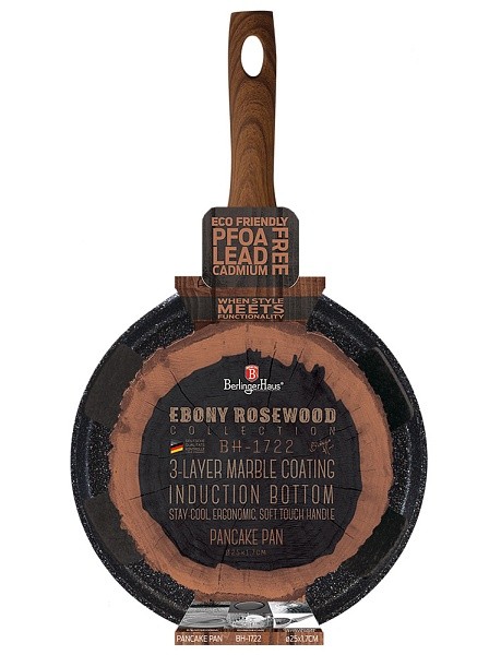Elegantní černá pánev na palačinky kolekce Ebony Line Rosewood má rukojeť v krásném dřevěném designu a uspoříte s ní až 35 % energie. Palačinková pánev má netradičně snížený okraj, aby se vám těsto snadno obracelo. Nepřilnavý 3vrstvý mramorový povrch usnadní přípravu palačinek, ke kterým nemusíte přidat ani kapku oleje navíc. Těsto se nepřipaluje a čištění je otázkou jen pár vteřin.