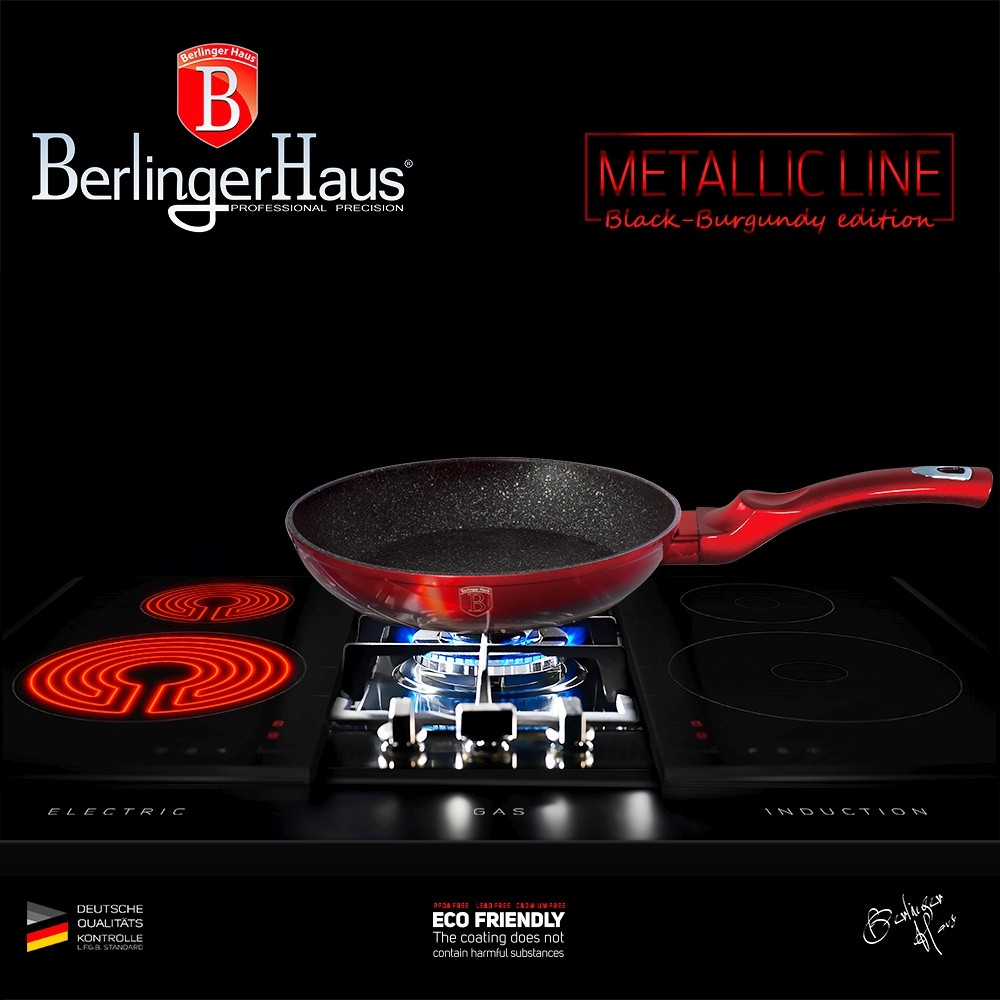 Univerzální pánev značky Berlingerhaus s mramorovým povrchem a ergonomickou rukojetí v atraktivním designu Black Burgundy Metallic Line. 3vrstvý povrch s mramorovým designem charakteristický svou dokonalou nepřilnavostí, připravované potraviny se nepřipalují a díky tomu se pánev velmi jednoduše čistí. Zároveň je vhodný pro zdravé vaření s minimem tuku nebo oleje, v závislosti na použitých surovinách klidně i bez jediné kapky tuku.