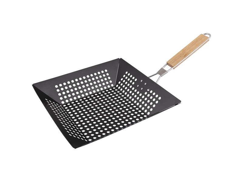 Grilovací pánev z lehké uhlíkové oceli a skládací rukojetí je určena na grilování příloh, zeleniny, ale také masa