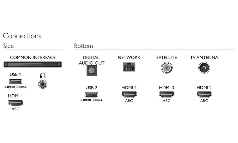 Rozhraní: Wi-Fi, Bluetooth, 4x HDMI, 2x USB 2.0, 1x CI+ slot, 1x optický audio výstup, 1x sluchátkový výstup, 1x RJ-45, 1x RF vstup, 1x LNB vstup