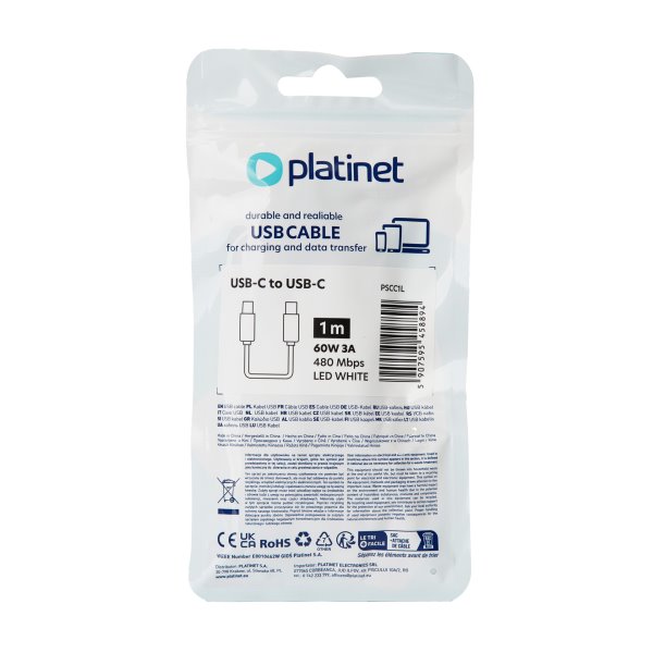 Platinet Nabíjecí Kabel USB-C - USB-C 3A, 60W, 1m, LED bílý