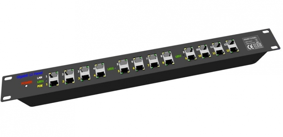 Panel do 19" racku integrující 12 gigabitových stíněných aktivních POE injektorů s napájecím rozsahem 24 - 57V.
