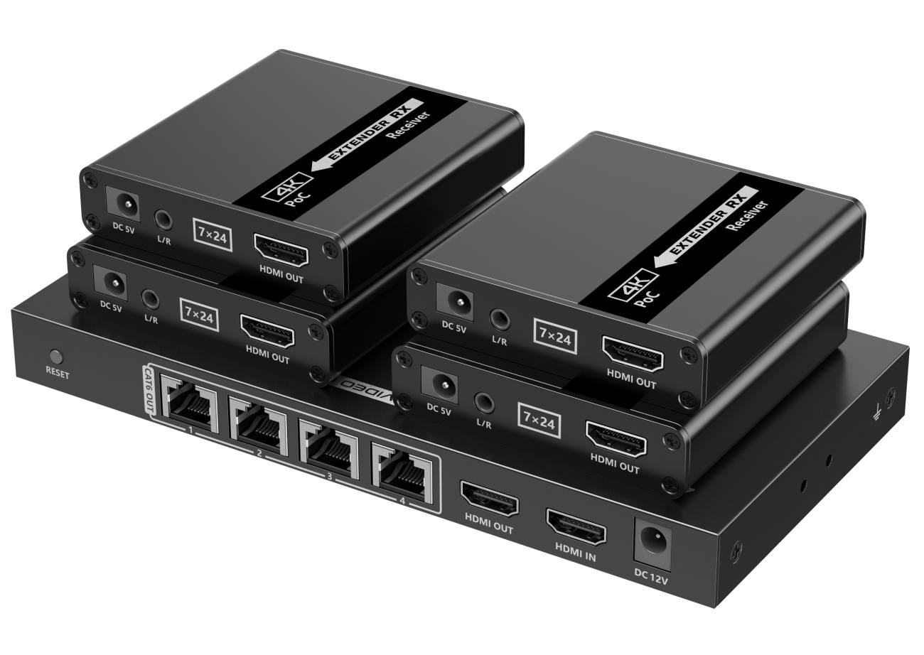 Extender se skládá z jedné vysílací jednotky s lokálním výstupem HDMI a čtyř přijímačů, které se propojí CAT6/6a/7 kabelem s vysílačem.