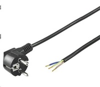 Flexo napájecí kabel v černém provedení pro montáž do zařízení. Třížilový kabel je zakončený standardní přístrojovou úhlovou zástrčkou a na druhém konci volné tři vodiče.