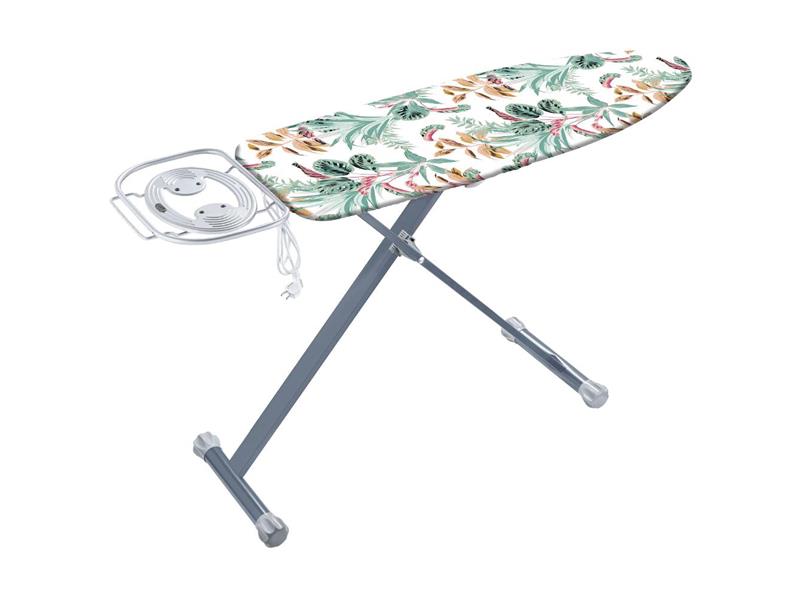 Rozměr: 125 x 45 cm Materiál: kov / bavlna Barva: černá konstrukce, barevný potah Kvalitní žehlící prkno opatřeno transportním zámkem, žehlící plochou odvádějící páru a elektrickou zásuvkou. Prkno má stabilní a bezpečnou konstrukci opatřenou protiskluzovými koncovkami u nohou…