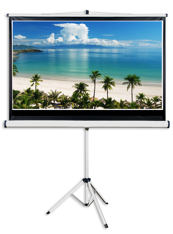 Mobilní projekční plátno vhodné pro digitální a zpětné projektory. Velmi stabilní základ na třech nohách, formát 16:9, matně bílé s černým orámováním.