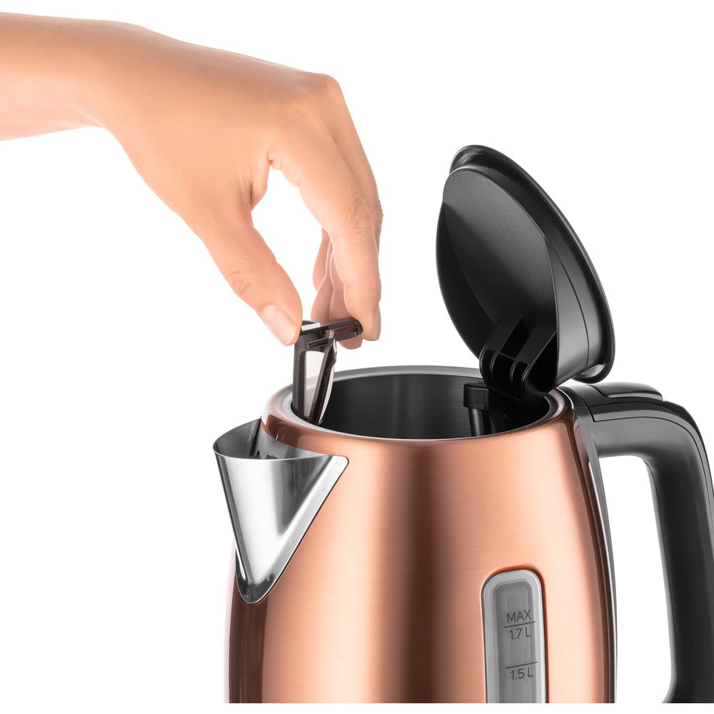 Po stisknutí tlačítka na rukojeti se konvice sama otevře, abyste ji mohli pohodlně naplnit vodou. Snadnému umístění konvice na podstavec napomáhá středový STRIX konektor a díky 360° rotační základně konvice zůstává pevně na svém místě, lze ji snadno zvednout a znovu usadit z jakéhokoliv úhlu. Konvice je opatřená vyjímatelným a omyvatelným filtrem pro zachycení nečistot a usazenin.