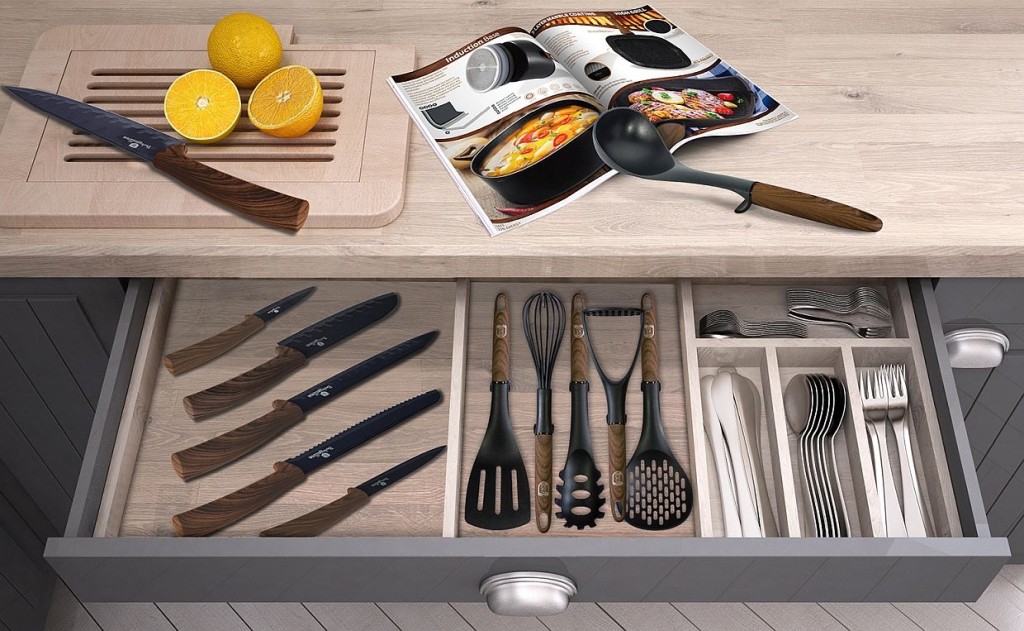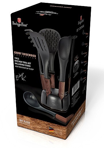 Sada kuchyňského náčiní kolekce Ebony Line Rosewood obsahuje obracečku, pěnovačku, naběračku, naběračku na těstoviny, servírovací lžíci, mačkadlo na brambory a designový otočný stojan v krásném dřevěném designu. Náčiní je vyrobené z nylonu, který je šetrný k vašemu nádobí a nikdy je nepoškrábe. Díky praktické nožičce uprostřed je hlavice náčiní ve vzduchu, takže si při jeho položení nezašpiníte kuchyňskou linku. Kuchyňské náčiní je ideální pro nepřilnavé i keramické povrchy a je odolné do 180 °C. Všechno náčiní má očko, takže je můžete pohodlně zavěsit. Designově dokonalé a funkční náčiní pro vaši moderní kuchyni.