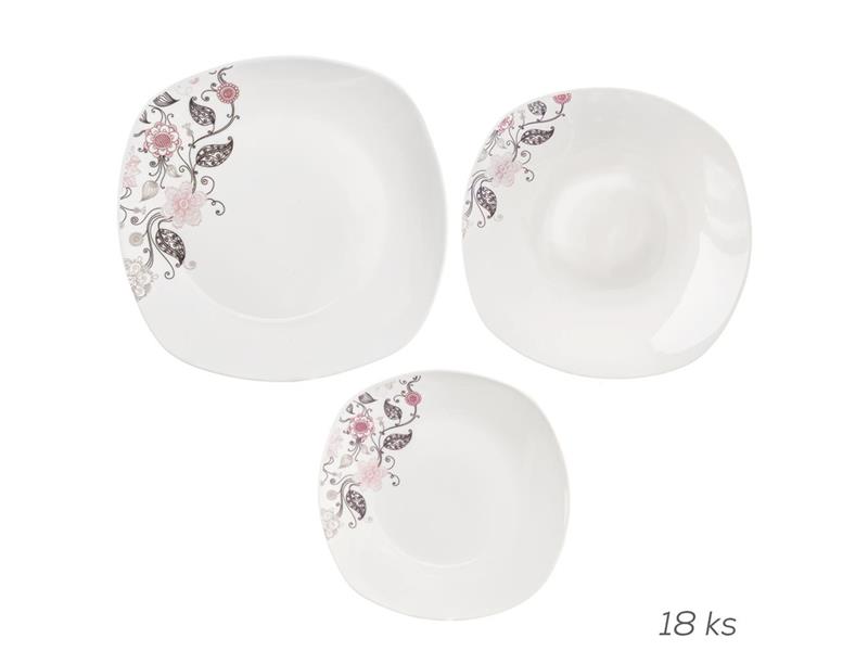 Jídelní sada porcelánová obsahuje 18 dílů – 6x talíř dezertní, 6x talíř hluboký a 6x talíř mělký. Hranatý tvar talířů. Jemný dekor. Talíře můžete dávat do myčky na nádobí, ale nedoporučejeme to – vlivem čistících prostředků používaných v myčkách může dojít k poškození dekoru (není pak důvod k reklamaci). Lze použít v mikrovlnné troubě.