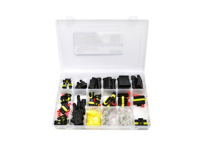 Sada 424 elektrických konektorů v 6 velikostech odpovídajících nejoblíbenějším průměrům drátů. Používá se v automobilovém průmyslu, např. pro senzory a zařízení v automobilech. Poskytují velmi dobrou izolaci a těsnost. „Superseal“ konektory vybavené pryžovým těsněním zaručují odolnost vůči brzdovým kapalinám, olejům a palivům. Balení je opatřeno…
