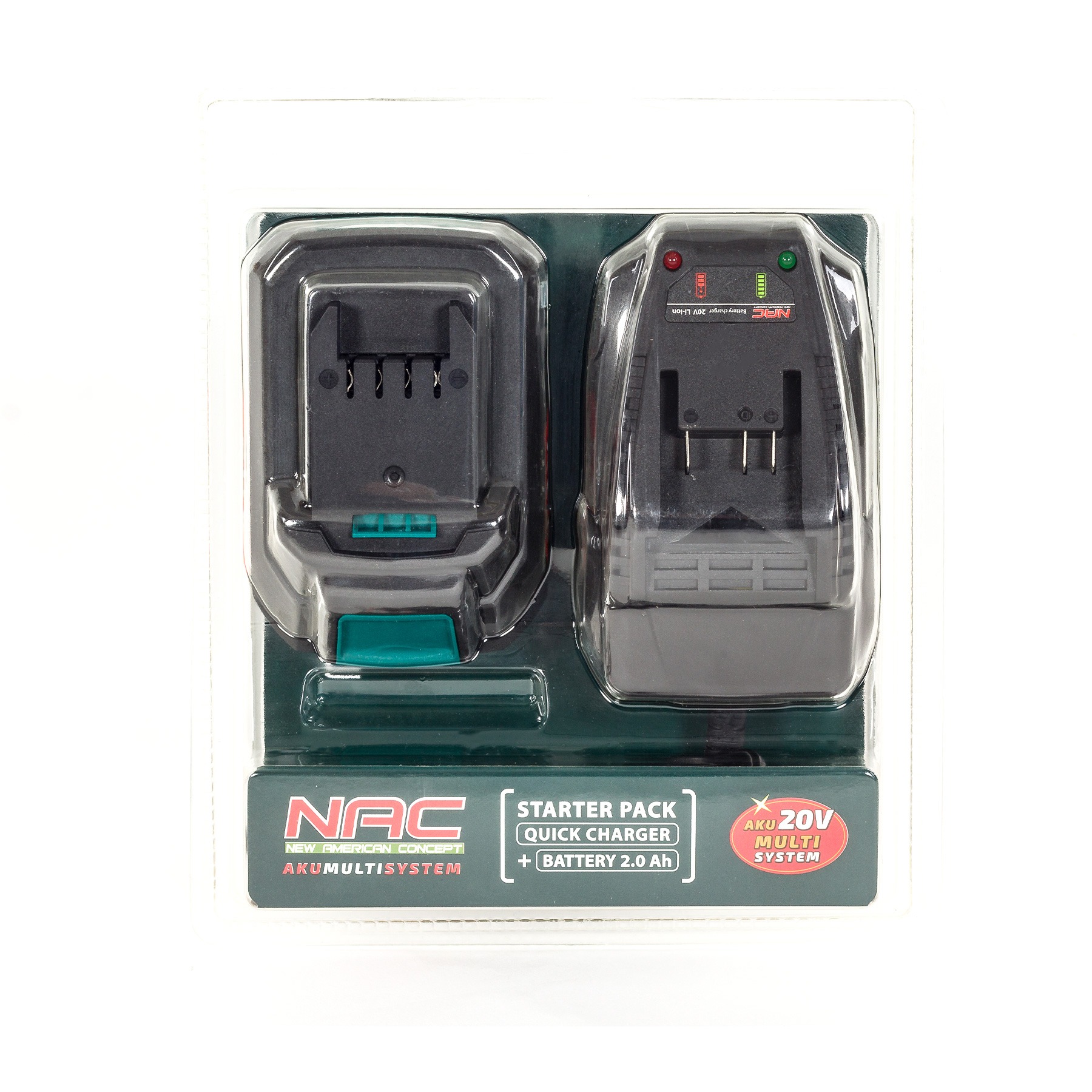 Vlastníte nářadí či jiný přístroj z řady AKUMULTISYSTEM 20V? Pořiďte si k němu startovací sadu NAC. Skládá se z baterie a síťové nabíječky. Baterie má kapacitu 2,0 Ah a obsahuje lithium-iontové články. Praktický indikátor vás informuje o stavu nabití. Za každé situace máte tedy neustálý přehled o tom, jestli je nabíjené zařízení připravené k provozu.