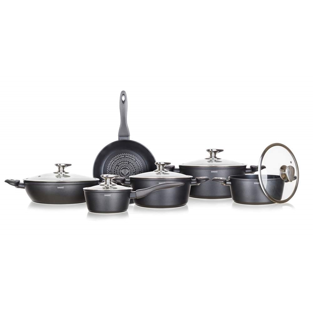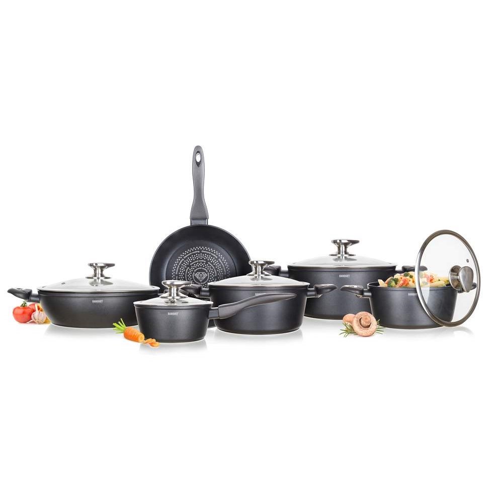 Trávíte u sporáku mnoho času a je to na vašich hrncích a pánvičkách znát? Pořiďte si jedinečnou sadu nádobí Diamond Matte Grey od Banquetu. Bakelitové rukojeti nádobí se soft touch úpravou vám padnou skvěle do ruky. Jednotlivé pánve a kastroly zapadají do sebe. Ušetříte spoustu úložného místa v kuchyni. Indukční dno u nádobí zvýší efektivitu přípravy a rychlost vaření.