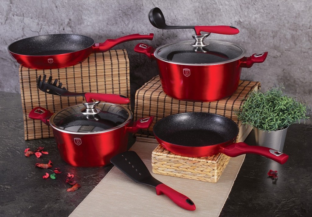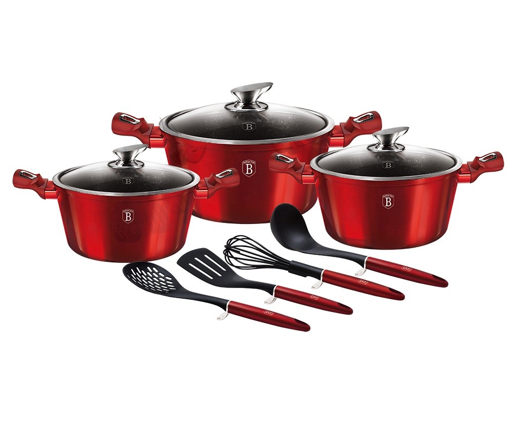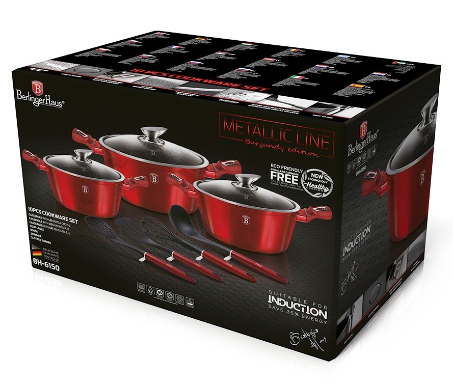 Krásná sada nádobí značky Berlingerhaus edice Burgundy Metallic Line se skládá celkem ze 10 kusů nádobí a kuchyňského náčiní. Nádobí v elegantním designu má 3vrstvý mramorový povrch, který je charakteristický svou dokonalou nepřilnavostí. Připravované potraviny se nepřipalují a díky tomu se nádobí velmi jednoduše čistí. Zároveň je vhodný pro zdravé vaření s minimem tuku nebo oleje a můžete uspořit až 35 % energie oproti obyčejným nerezovým kastrolům. Vnitřní i vnější vrstva neobsahují žádné škodliviny, výsledné pokrmy tak neztrácí vařením svoje vitamíny.