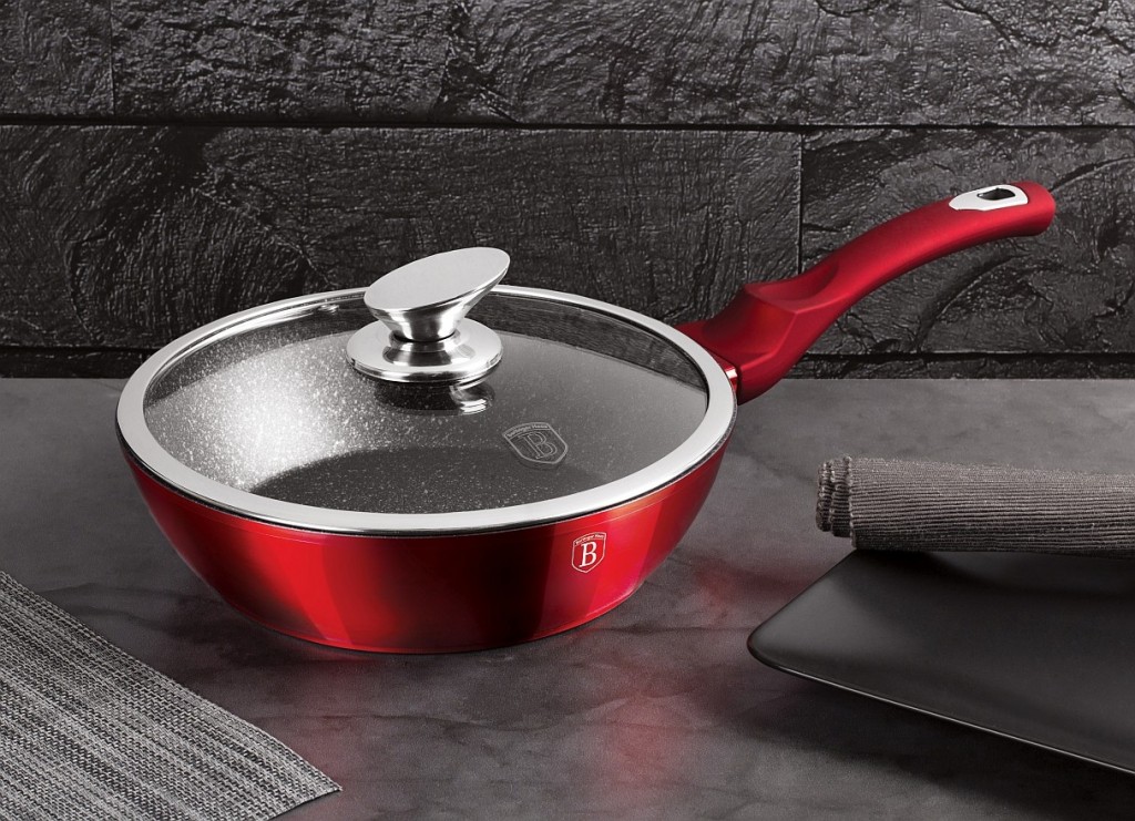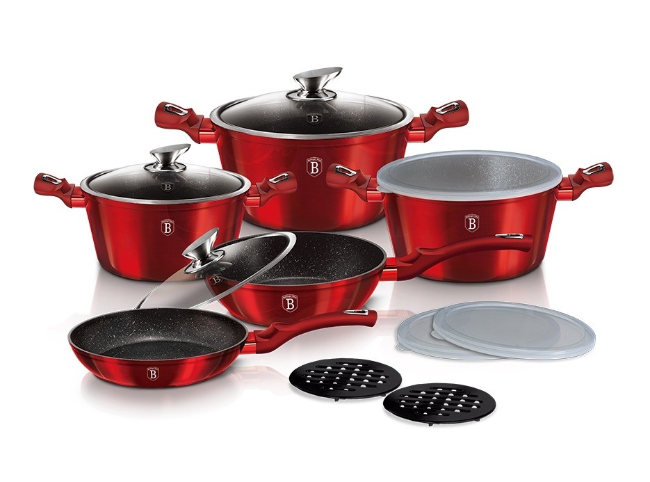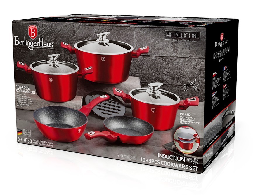 Vyjímečná sada nádobí značky Berlingerhaus edice Burgundy Metallic Line se skládá celkem ze 13 kusů nádobí a kuchyňského náčiní. Nádobí v elegantním designu má 3vrstvý mramorový povrch, který je charakteristický svou dokonalou nepřilnavostí. Připravované potraviny se nepřipalují a díky tomu se nádobí velmi jednoduše čistí. Zároveň je vhodný pro zdravé vaření s minimem tuku nebo oleje a můžete uspořit až 35 % energie a času oproti obyčejným nerezovým kastrolům.