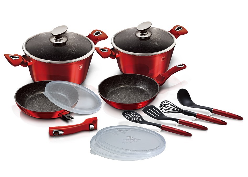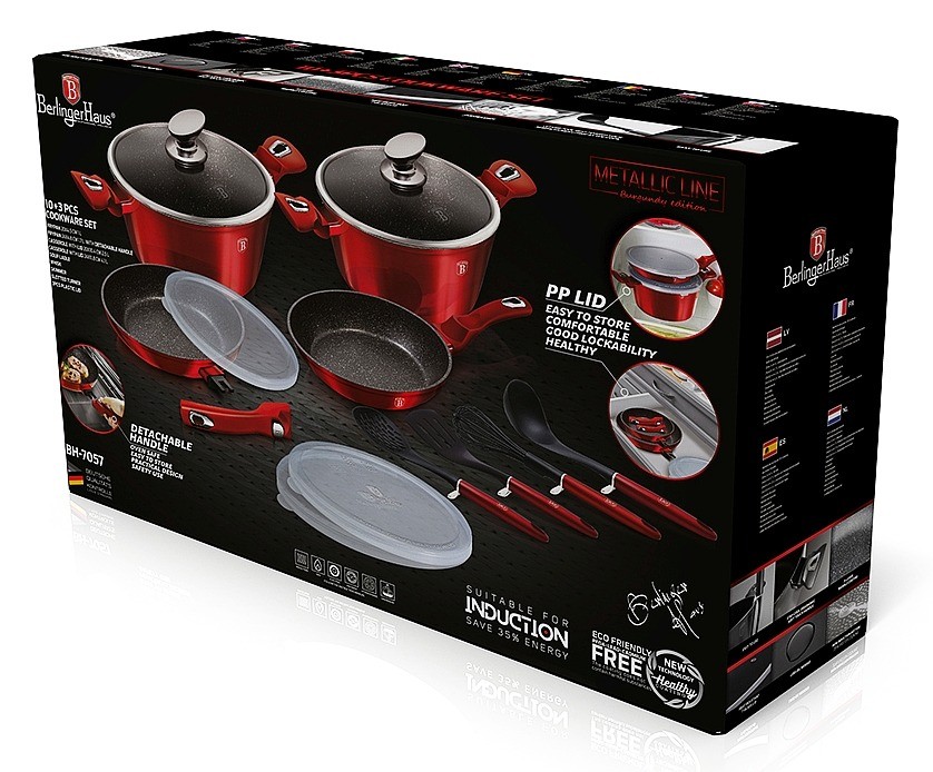 Bohatě vybavená sada nádobí z metalické burgundy kolekce zaujme nejen nepřehlédnutelným moderním designem, ale především svými jedinečnými vlastnostmi. V sadě jsou navíc 3 praktická víčka, kterými můžete nádoby uzavřít. Větší pánev má odnímatelnou rukojeť a můžete ji tak používat pro zapékání v troubě až do 220 °C, navíc šetří místo při skladování. Zároveň je nádobí vhodné pro zdravé vaření s minimem tuku, v závislosti na použitých surovinách klidně i bez jediné kapky tuku. Ušetříte až 35 % energie a času oproti obyčejným nerezovým kastrolům.