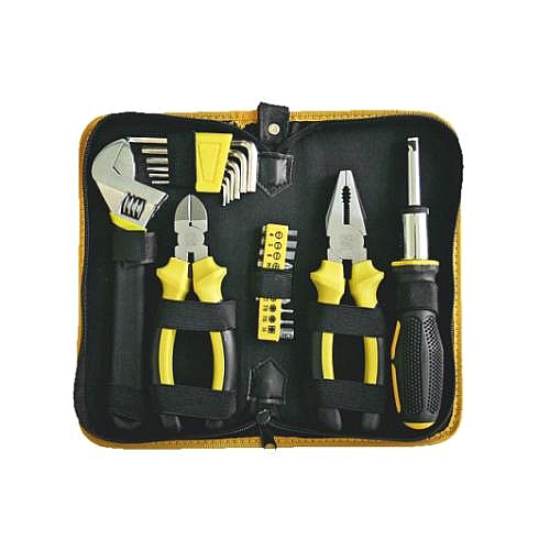 Sada nářadí Technické parametry: - 1 - Klíč stavitelný - francouzský 200 mm - 6 - Sada klíčů IMBUS HEX 2, 2.5, 3, 4, 5, 6 mm - 1 - Kleště štípací boční 155 mm - 1 - Kleště kombinované 180 mm - 1 - Šroubovák ráčnový na bity - 10 - Sada bitů