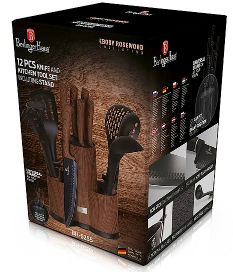 - Sada obsahuje: 5 nožů + stojan + 6 kusů kuchyňského náčiní