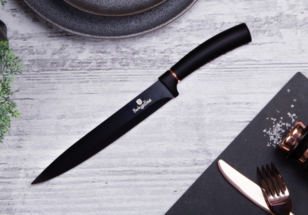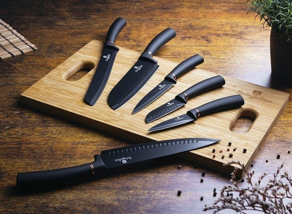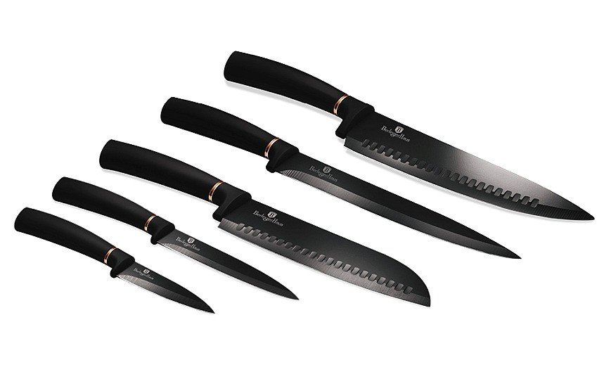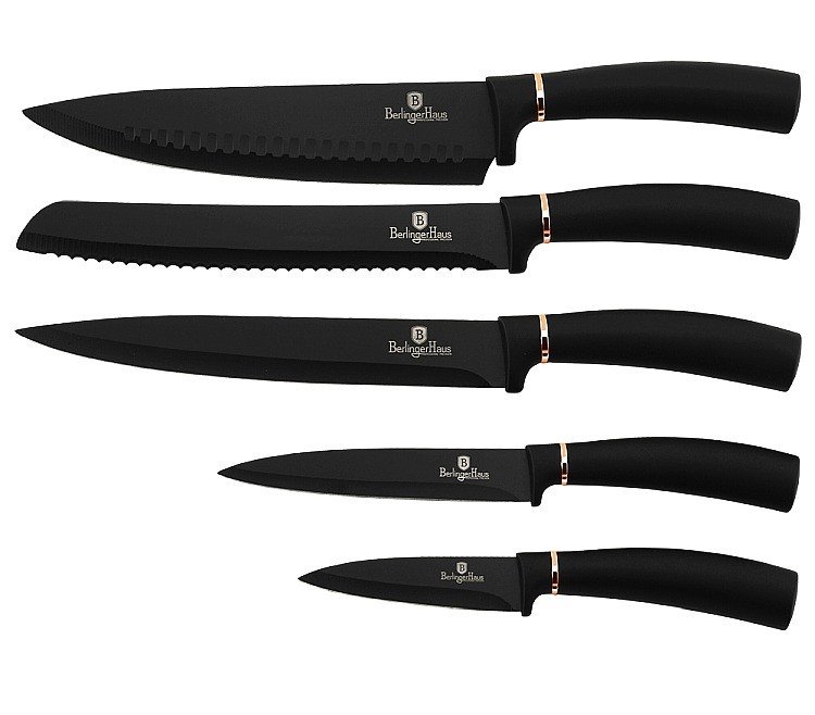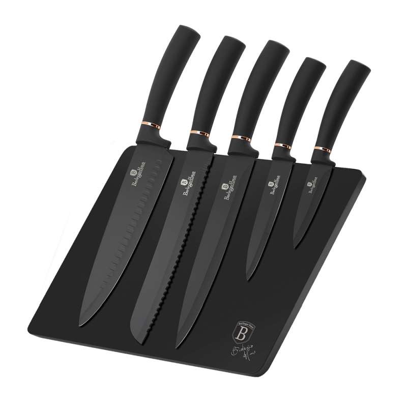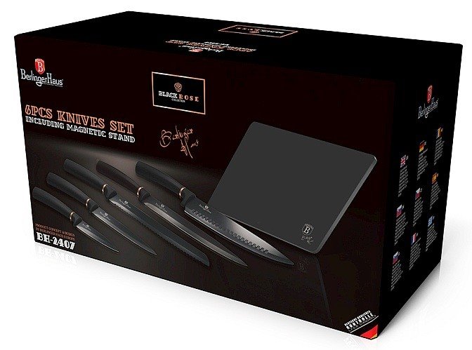 Sada Berlingerhaus Black Rose Collection se skládá z 5 nožů a magnetický stojanu. Jejich čepele se vyrábí z 1 kusu nerezové oceli a jsou potažené černým nepřilnavým povrchem. Díky laserovému broušení na nich krájené potraviny neulpívají a snadno je očistíte. Bez obav je umyjete i v myčce nádobí.