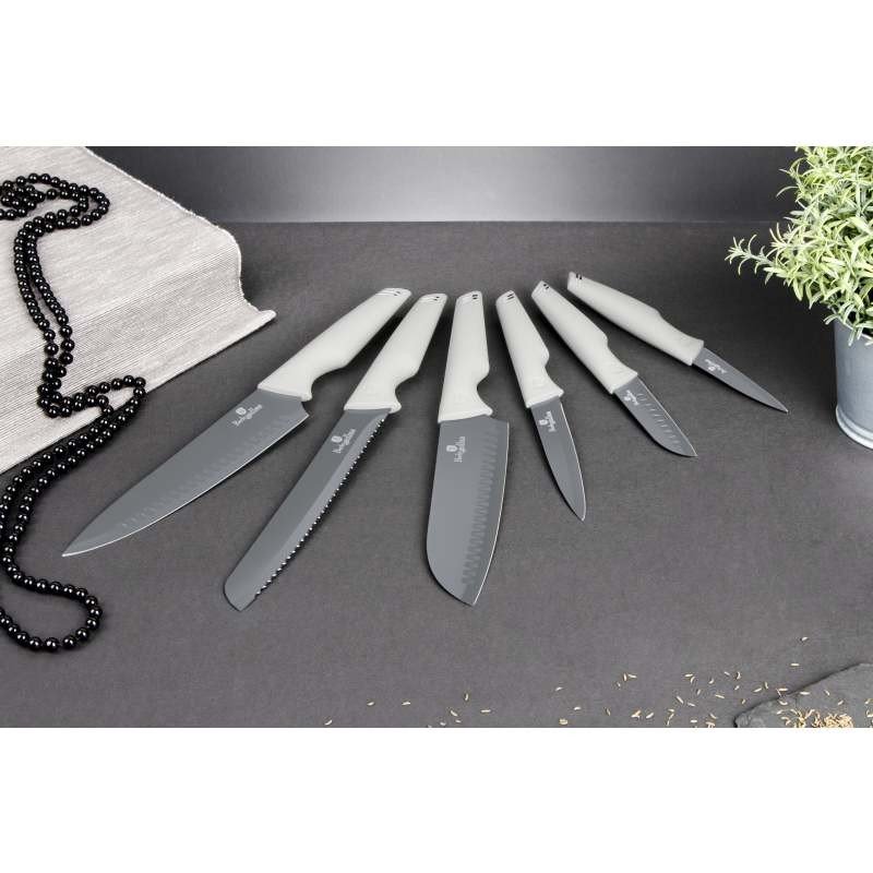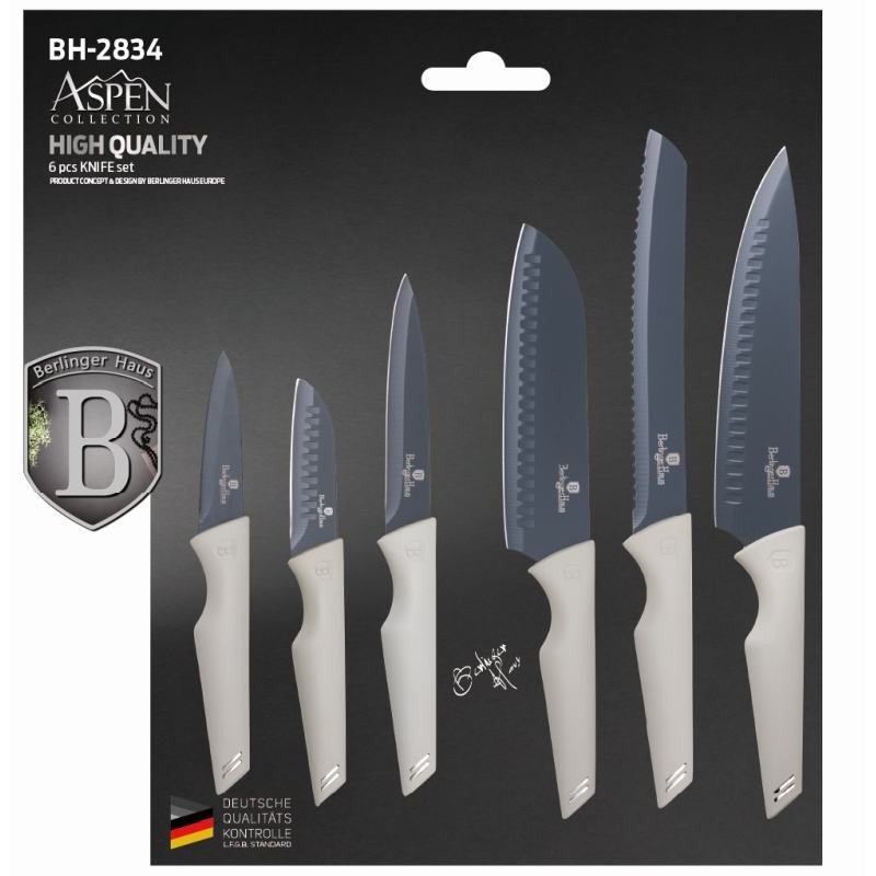 Sada Berlingerhaus Aspen Collection se skládá z 6 nožů. Jejich čepele se vyrábí z nerezové oceli s tmavě šedým nepřilnavým povrchem. Jsou antibakteriální a nepřenáší pachy. Nezůstávají na nich skvrny od jídla a snadno je umyjete.