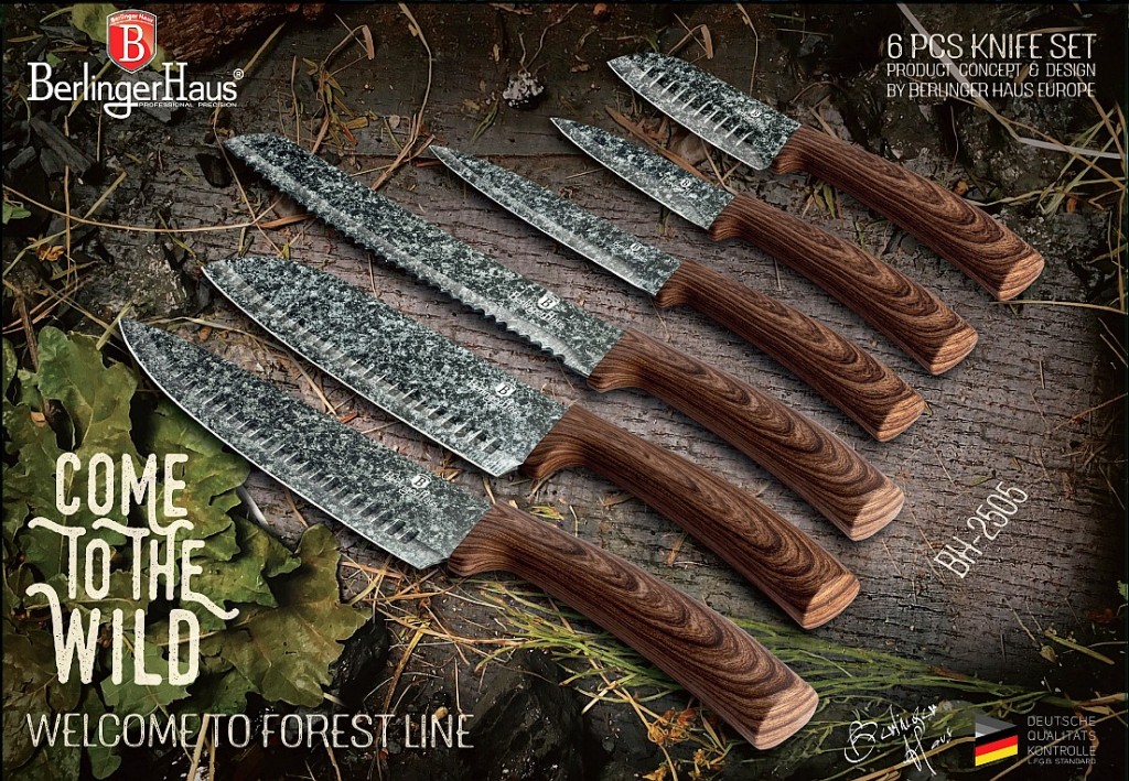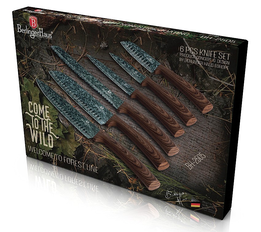 Krásná sada kolekce Forest Line obsahuje 6 nožů, které mají čepele z nerezové oceli s antiadhézním nepřilnavým povrchem. Laserem broušené ostří pro dokonalé výsledky při krájení, nemusíte často brousit. Antibakteriální povrch je citlivý k potravinám, při krájení si uchovají svoje vitamíny i chuť či aroma. Díky nepřilnavému povrchu se krájené potraviny na nůž nikdy nebudou lepit. Ergonomická měkčená rukojeť skvěle padne do ruky, díky tomu je krájení bezpečné a pohodlné. Rukojeť je navíc protiskluzová a má bezpečnostní zarážku prstů.