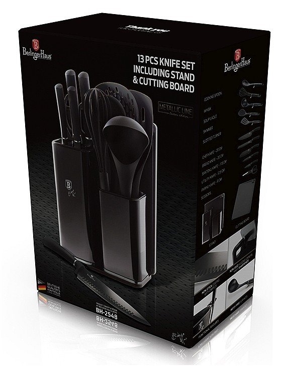 Sada nožů a dalšího kuchýňského náčiní Berlingerhaus Carbon Metallic Line BH-2548 obsahuje celkem 13 ks, které se hodí pro zpracování surovin všeho druhu. Zahrnuje nejčastěji používané pomůcky pro vaření a smažení, které budete mít vždy připravené po ruce. Nechybí zde 20cm kuchařský nůž, 20cm nůž na pečivo, 17,5cm japonský nůž Santoku, 12,5cm univerzální nůž, 9cm loupací nůž, kuchyňské nůžky, polévková naběračka, varná lžíce, naběračka na špagety, skimmer, štěrbinová obracečka, prkénko s integrovaným brouskem a praktický stojánek pro přehledné uložení.