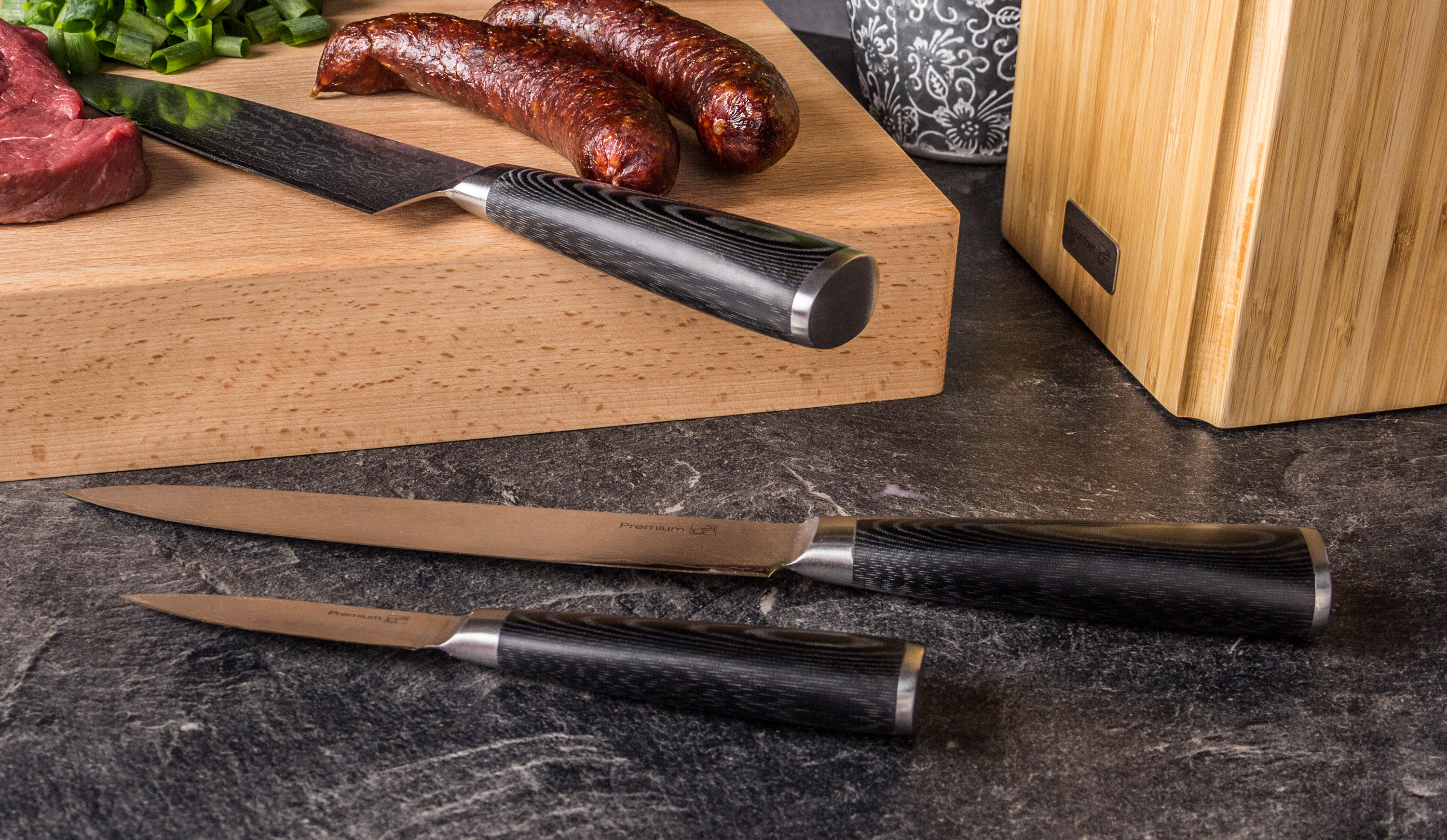 Rukojeť je vyrobena z extra pevného a odolného laminátového materiálu, nazývaného Micarta. Micartu tvoří plátno nebo skelná tkanina s termostatickou pryskyřicí. Výsledkem je pevná, houževnatá rukojeť, která nepodléhá zkáze času. Hladké, rovné, čisté linie těchto nožů se stanou ozdobou každé kuchyně.