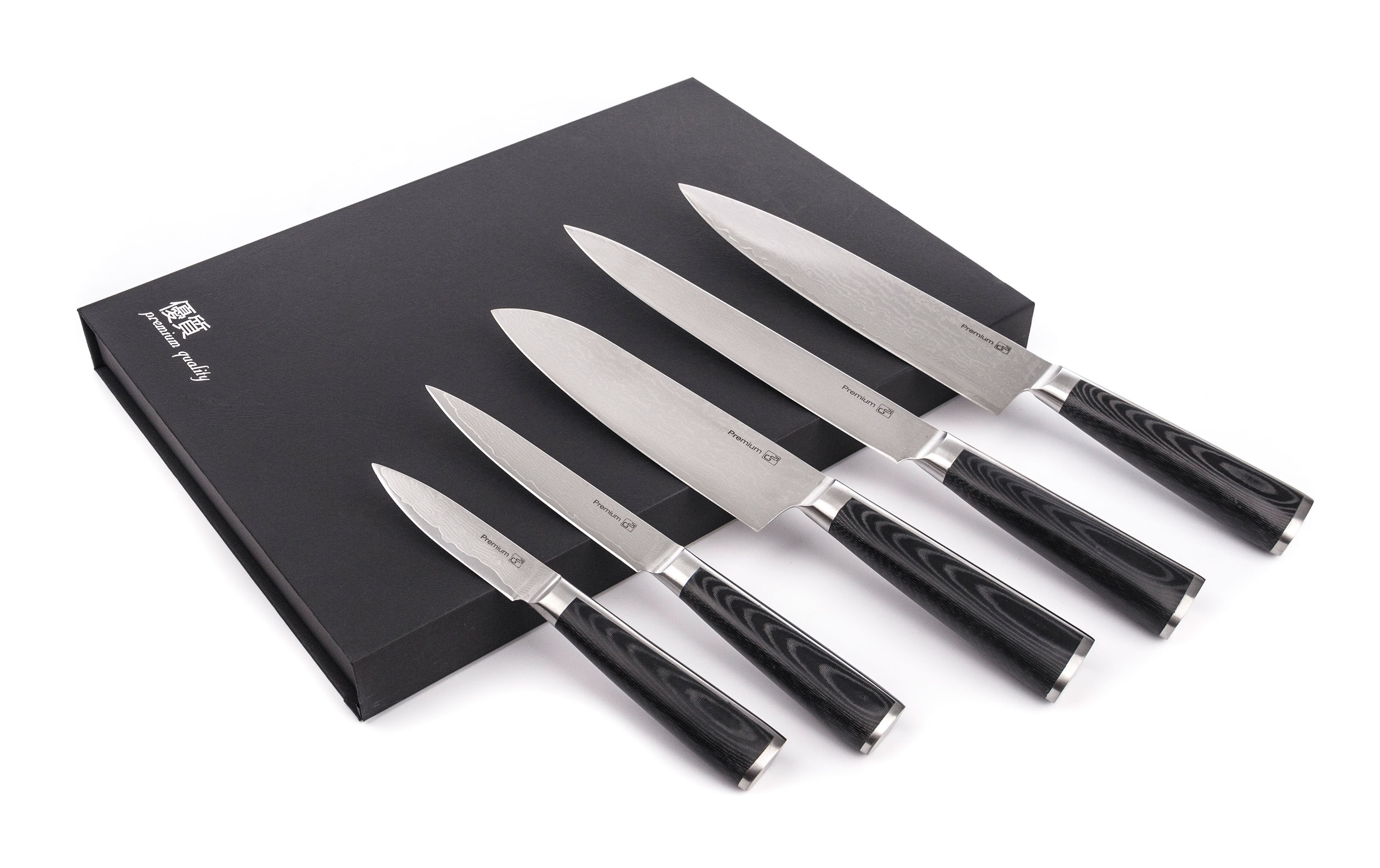 Sada nožů z damaškové oceli v kuchyni jsou skvělou volbou. Damascénská ocel má vyšší tvrdost a odolnost vůči opotřebení, díky vzácné a unikátní kresbě oceli navíc získáte jedinečnou kombinaci krásy a luxusu s vynikajícími řeznými vlastnostmi. V sadě najdete pět nožů – nůž šéfkuchaře o délce 20 cm, dva krájecí nože o délce 20 a 13 cm, Santoku nůž 17 cm a univerzální nůž 9 cm.