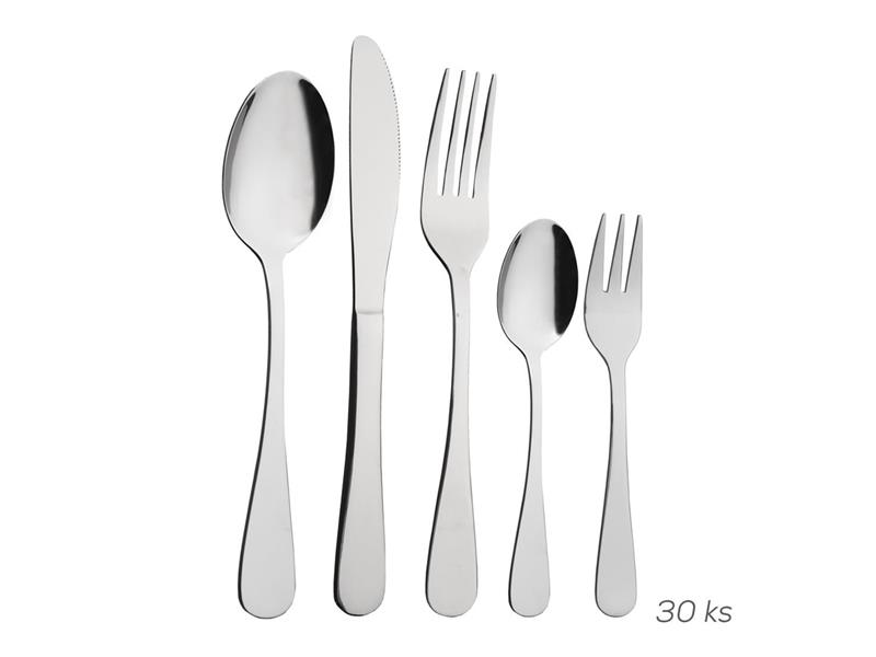 - Sada obsahuje: 6x lžíce (d. 19,5 cm), 6x vidlička (d. 20 cm), 6x nůž (d. 21,2 cm), 6x čajová lžička (d. 13,5 cm) a 6x dezertní vidlička (d. 13,5)