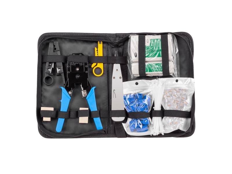 Síťová sada 9 prvků LAN + pouzdro Sada nástrojů pro budování počítačových sítí: - Krimpovací nástroj RJ9 RJ11 RJ12 RJ45, vestavěný odizolovač a řezačka - KRONE rázový nástroj - vyšší model izolačního odizolovače s krimpovací koncovkou KRONE LSA - RJ9 RJ11 RJ12 tester RJ45 - 20 RJ45 zástrčky - 20 bundy svíček - sada 20 svorky - RJ45 splitter RJ45…