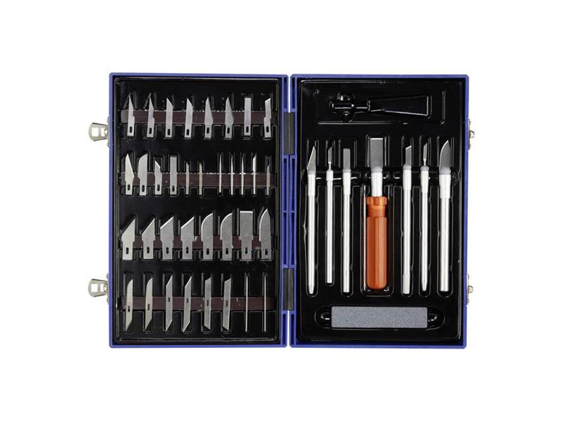 Sada nožů, 50dílná Basetech 1521271, stříbrná. Držáky čepelí v této 50dílné sadě nožů jsou ze slitiny hliníku a čepele jsou vyrobeny z tvrzené oceli. Čepele nožů lze naostřit pomocí dodávaného brusného kamene. Sada se dodává v praktickém plastovém kufříku. Praktické, jednoduché a efektivní nářadí pro úspěšnou práci.
