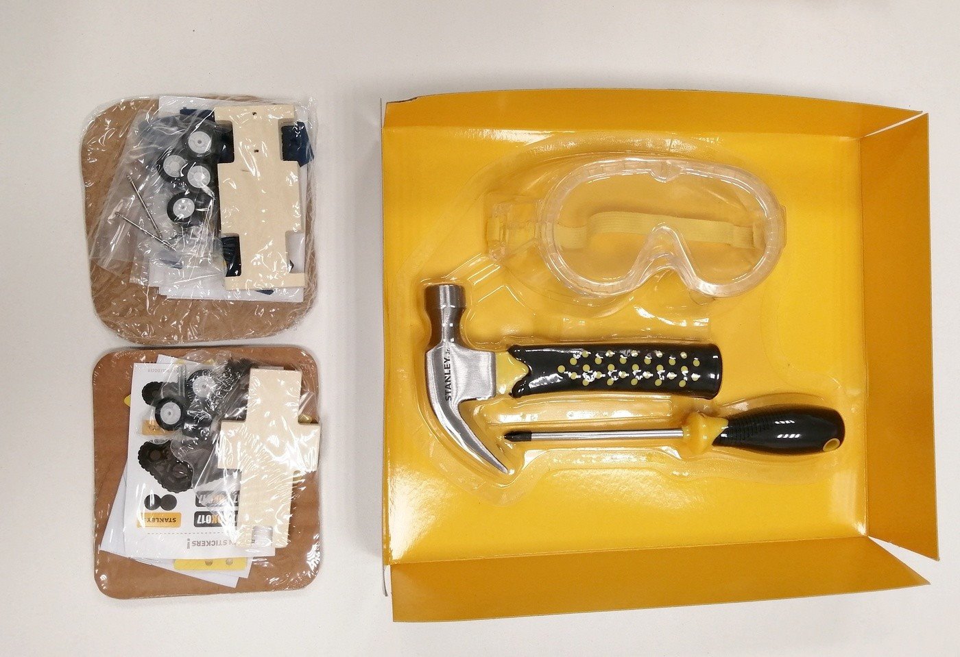 Tráví vaše dítě rádo čas s vámi, strejdou nebo dědou v garáži? Sleduje, jak opravujete a pečujete o své auto? Pořiďte mu sadu Stanley Jr., která zabaví každého malého kutila. V balení najde šroubovák, kladivo, ochranné brýle a autíčka k sestavení. Nářadí má stejnou kvalitu jako nástroje ve vaší dílně. Části šroubováku a kladiva se vyrábí z kovu. Pogumovaná rukojeť je navíc přizpůsobená pro děti od 5 let a neklouže jim z ruky.
