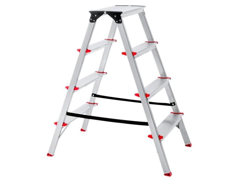 Oboustranné hliníkové schůdky 2x4 (4+4) jsou lehké a skladné. Schůdky jsou ideálním pomocníkem a najdou široké uplatnění v každé domácnosti, na chatě či chalupě nebo v obchodu popř. kanceláři. Ať už potřebujete umýt okna, vyměnit žárovku nebo uložit věci do vysokých skříní - schůdky Venbos jsou vždy připraveny k rychlému použití. A když je nebudete potřebovat, jednoduše je složíte a schováte je do komory, za skříň nebo pod postel. Schůdky mají nahoře praktickou rovnou plochu. Schůdky jsou vyráběny s důrazem na vysokou kvalitu a bezpečnost. Schůdky Vám tak vydrží dlouhá léta. Bezpečnost pohybu po schůdcích zvyšuje protiskluzové rýhování nášlapů. Rýhované příčle o šířce 8 cm se širokou nášlapnou plochou. Bezpečnou stabilitu schůdků zajišťují kvalitní protiskluzové patky, které zároveň brání poškození povrchu, na němž jsou schůdky použity.