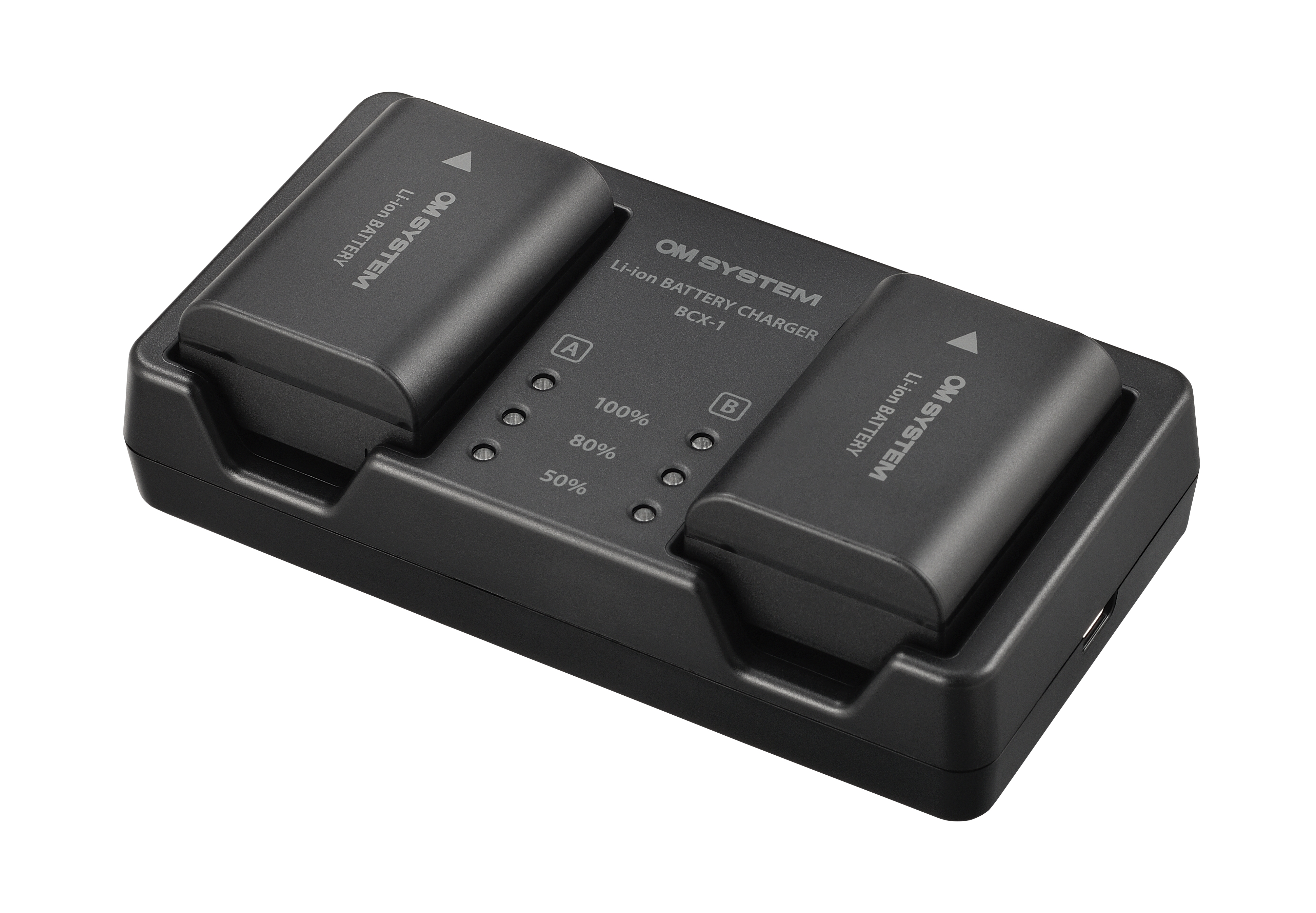 Sada příslušenství OM System SBCX-1 Kit obsahuje 2 280mAh Li-Ion akumulátor BLX-1 a duální nabíjecí stanici BCX-1, která zvládne současně nabít až 2 tyto baterie již za pouhých 150 minut. Tato nabíječka je vybavena moderním USB-C rozhraním, s jehož pomocí můžete k napájení využívat adaptér F-7AC, dodávaný společně s kompaktním fotoaparátem OM-1, nebo jakýkoliv jiný síťový zdroj s tímto rozhraním na trhu. Stanice rovněž podporuje technologii Power Delivery 3.0, která umožňuje použití powerbanky k nabíjení jednotlivých akumulátorů, když jste v terénu nebo na cestách.