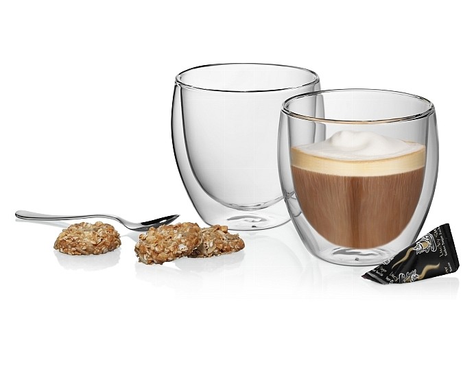 Sada dvou sklenic Cortana značky Kela o objemu 200 ml využijí všichni milovníci kávy. Jsou ideální především pro přípravu cappuccina, malé i velké kávy nebo horké čokolády. Sklenice jsou vyrobené ze žáruvzdorné borosilikátové skla s dvojitou stěnou, která díky vytvořenému vakuu udrží teplotu nápoje po dlouhou dobu. Dvoustěnné vakuové sklo má výborné termoizolační vlastnosti, takže vnější vrstva sklenice zůstává na dotek chladná i při použití horkého nápoje. Materiál je velmi odolný vůči škrábancům a prasklinám. Vhodné do myčky nádobí.