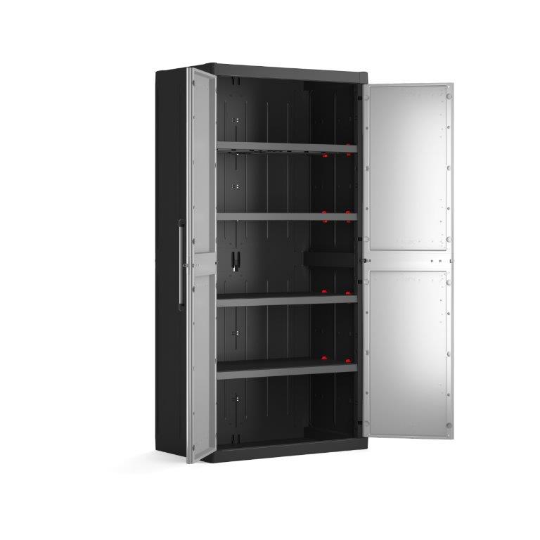 Skříň obsahuje celkem 4 přídavné police - každá s výraznou nosností až 25 kg, které přijdou vhod pro výrazně těžší předměty všeho druhu. Lze ji tedy využít pro skladování dílenského nářadí či zahradnických potřeb, například pro uložení náčiní s dlouhou násadou, které by se jinam nevešlo. Díky svému provedení v neutrální šedé barvě zapadne do každého prostoru bez ohledu na jeho konceptuální styl.