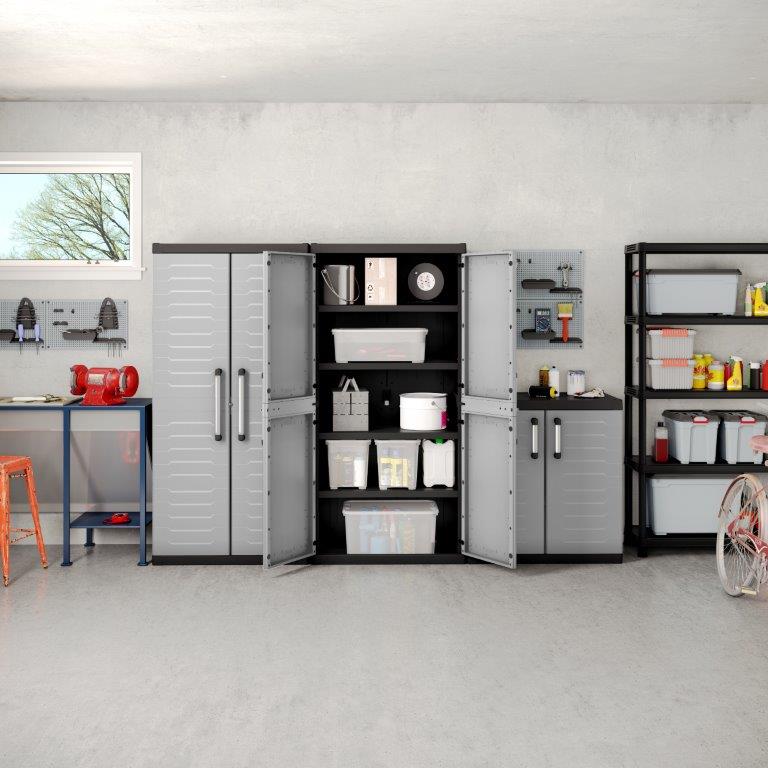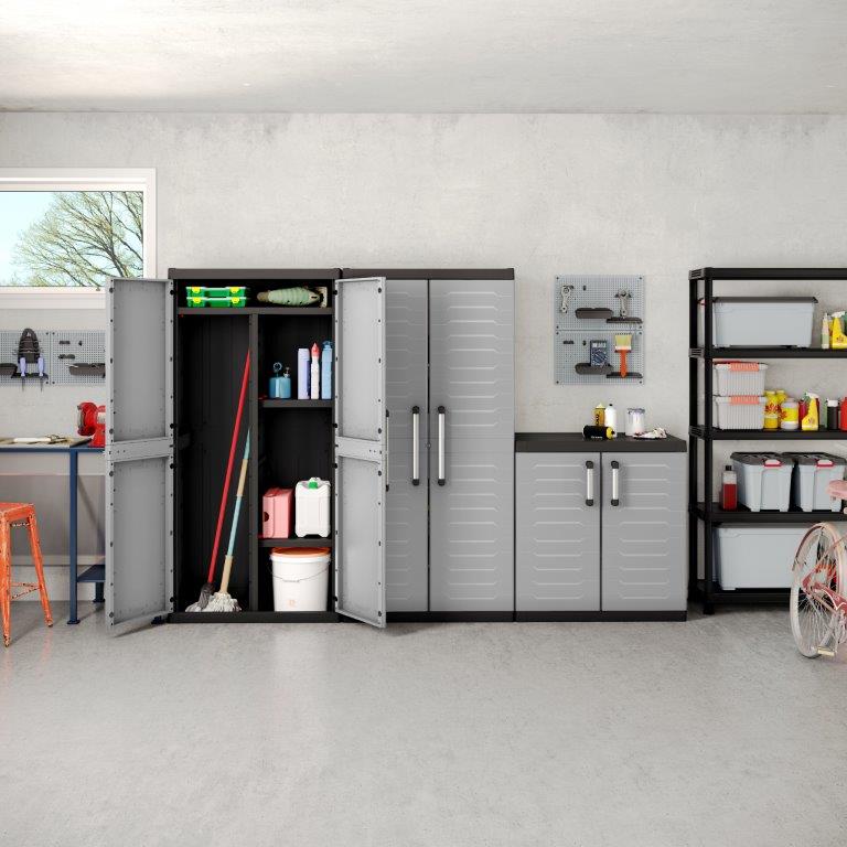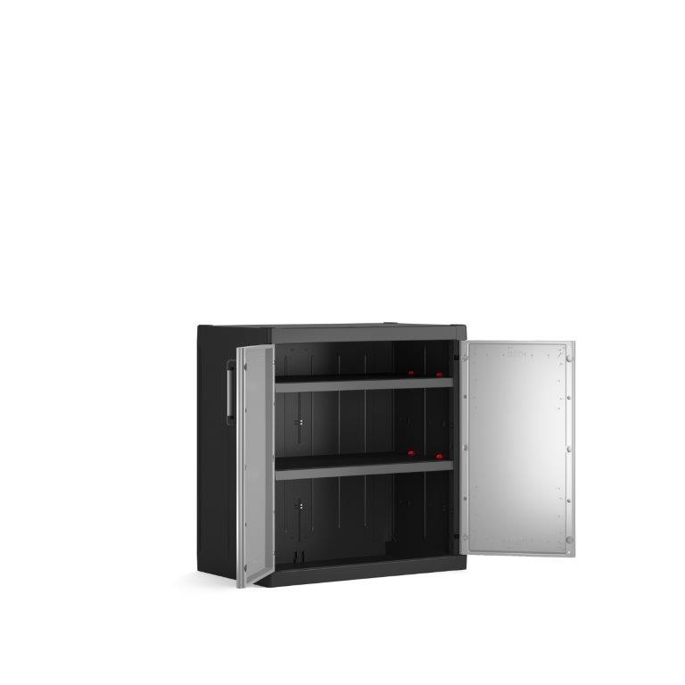 Skříň obsahuje celkem 2 přídavné police - každá s výraznou nosností až 25 kg, které přijdou vhod pro výrazně těžší předměty všeho druhu. Lze ji tedy využít pro skladování dílenského nářadí či zahradnických potřeb, například pro uložení náčiní, které by se jinam nevešlo. Díky svému provedení v neutrální šedé barvě zapadne do každého prostoru bez ohledu na jeho konceptuální styl.