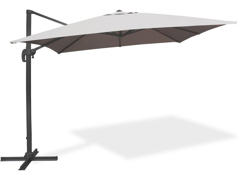Slunečník FIELDMANN FDZN 5107 Technické parametry: - Závěsný slunečník o rozměru 3x3 m - Světlešedý potah z 100% polyesteru 250 g - Materiál: hliník /ocel/polyester - 8 ocelových žeber 14 × 24 mm - Možnost otočení o 360 ⁰ dle potřeby - Možnost nastavení úhlu sklonu - Průměr hliníkové tyče 4,8 cm - Pro venkovní použití