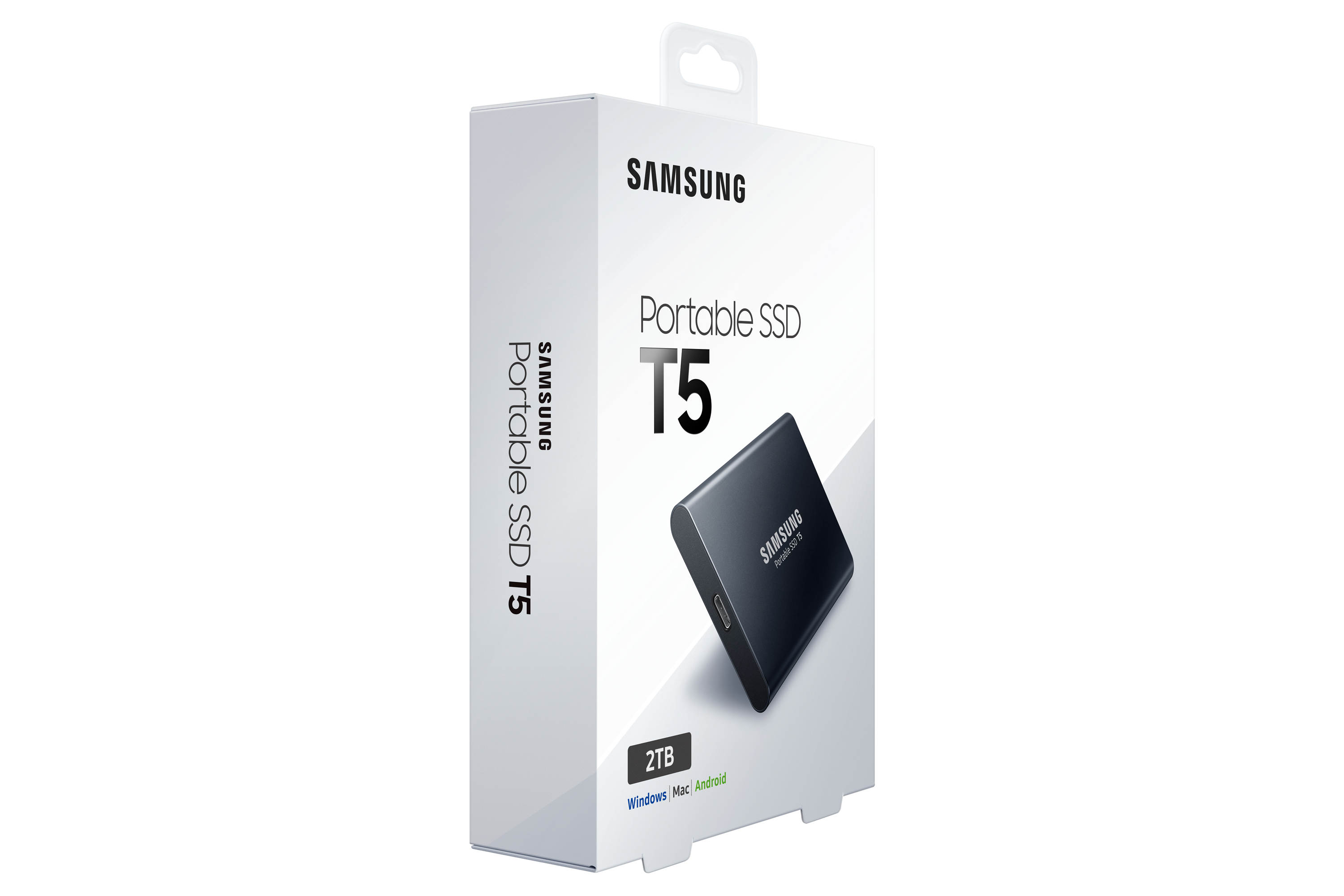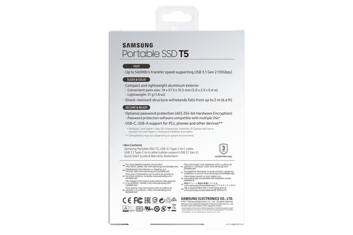 Přenosný disk Samsung SSD T5 dosahuje vyšší rychlosti a tím i nové úrovně přenosu a externího ukládání dat. Díky kompaktnímu, odolnému designu a zabezpečení pomocí hesla je ideální pro přenášení a vysoké zabezpečení uchovávaných dat.