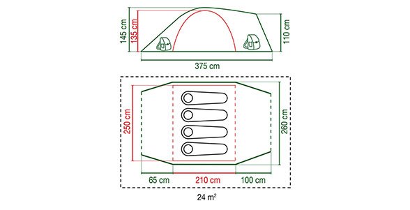 - Vnější stan: polyesterová taffeta 68D, UV GUARD, PU zátěr, podlepené