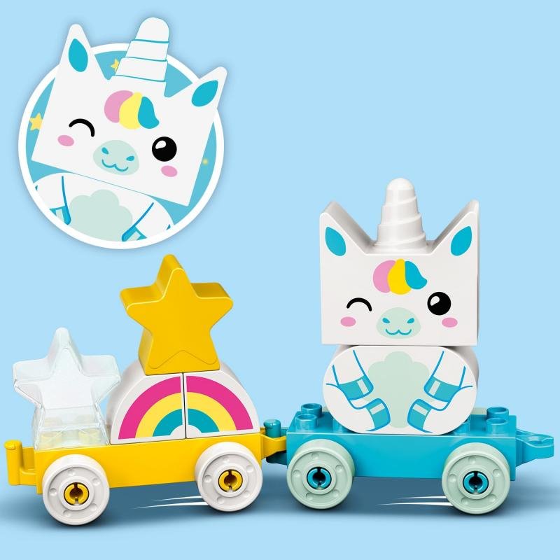 Stavebnice obsahuje sestavitelného jednorožce, 2 hvězdičky, duhu a 2 vagóny. Dílky včetně jednorožce dítě připevňuje k vagónům na kolečkách. Stavitelské kartičky mu pomáhají správně sestavit jednotlivé modely. Váš potomek se řídí předlohou nebo si staví podle vlastní představivosti. Během hraní se učí barvy a tvary. Sadu můžete rozšířit o další stavebnice řady DUPLO.
