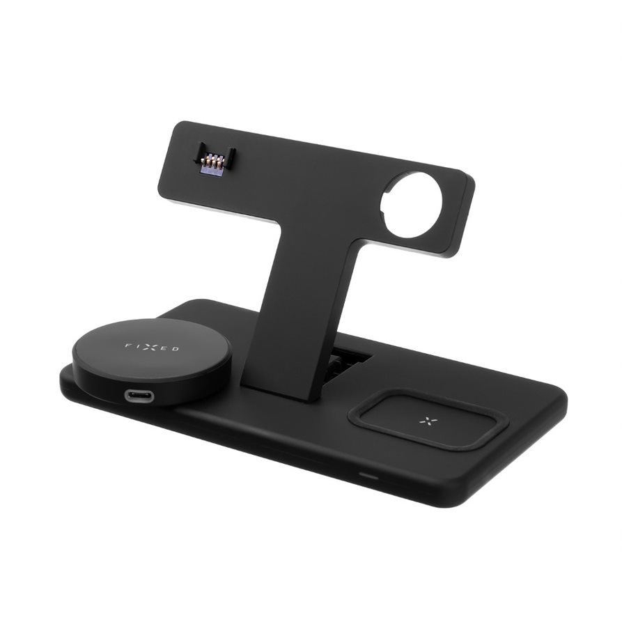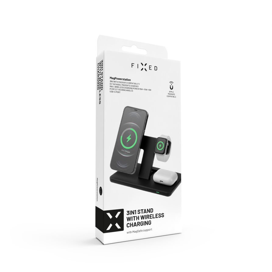 Stojánek FIXED MagPowerstation s bezdrátovým nabíjením 3 v 1 a uchycení Magsafe, 15W + 15W + 15W, černý